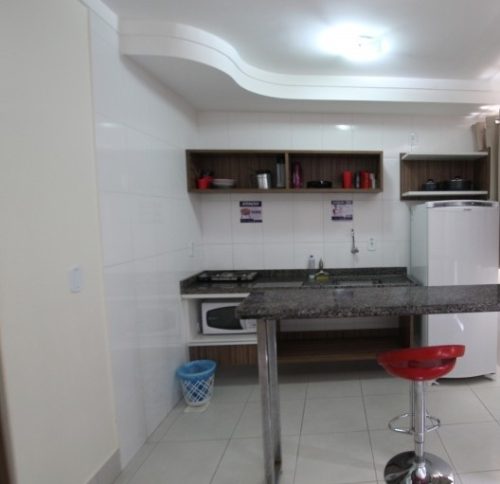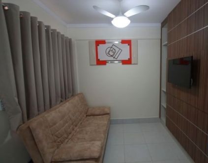 Apartamento com sala, sofá, tv e ventilador de teto, mini cozinha com fogão elétrico com duas chamas, geladeira, microondas e utensílios básicos, para refeições leves, um quarto com cama de casal, ar, tv, armário e um banheiro.
