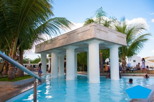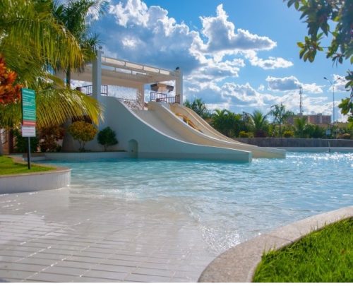 Área de lazer com piscinas termais, piscina de ondas, toboáguas, rampa, bar molhado, ofurô lanchonete e restaurante.